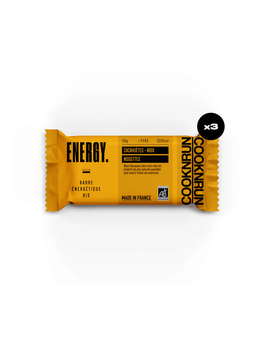Barre énergétique Cacahuètes, Noix & Noisettes Bio Cooknrun, 100 % naturelle, vegan et fabriquée en France.