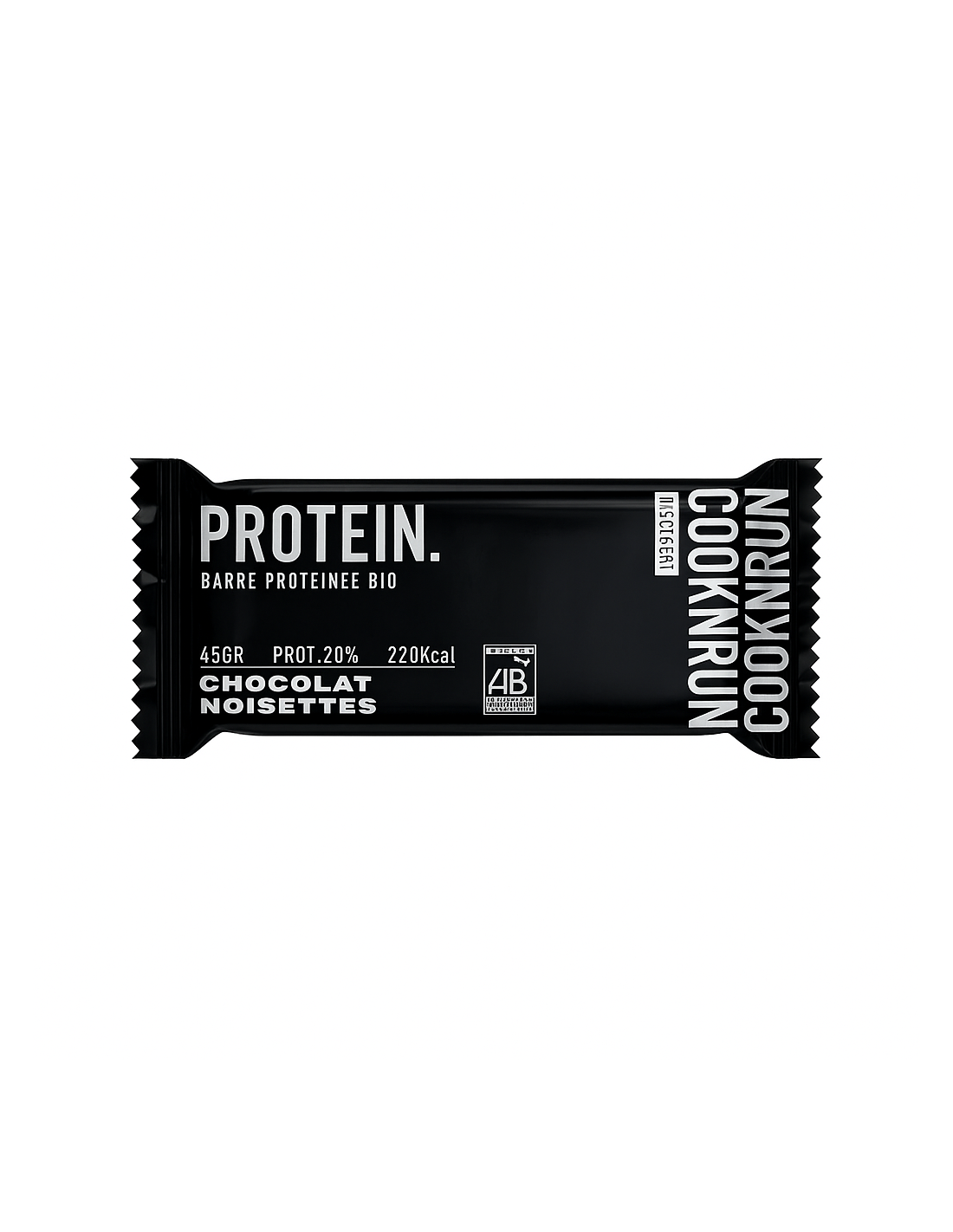 Barre protéinée Chocolat Noisette Bio Cooknrun, 100 % naturelle, vegan et fabriquée en France.