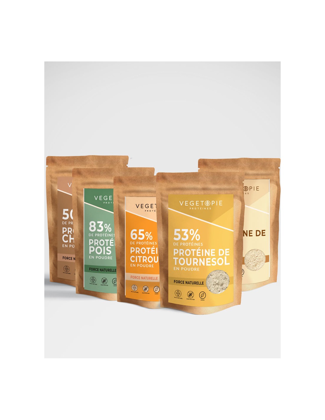Découvrez nos 5 protéines végétales crues en poudre réunies dans un pack.